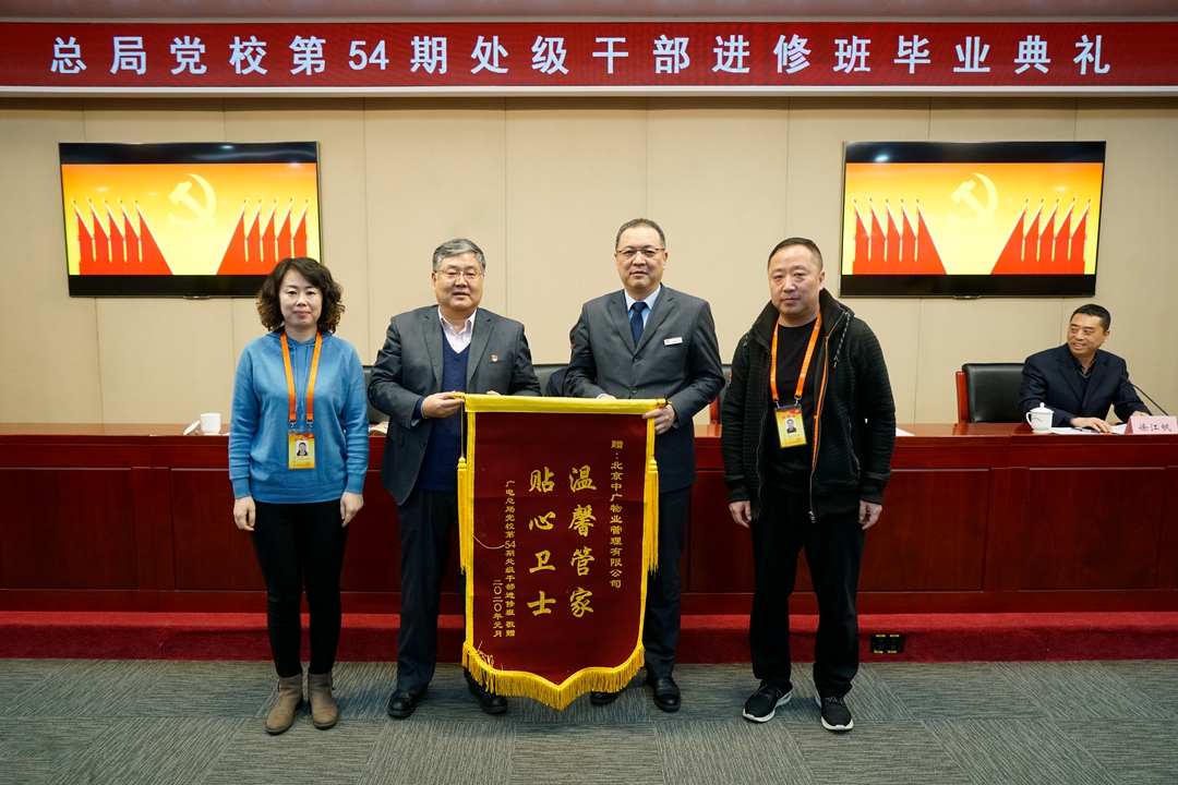 2020年1月8日,在總局黨校第54期處級干部培訓(xùn)班結(jié)業(yè)儀上,培訓(xùn)班學(xué)員為感謝中廣物業(yè)在此期間為學(xué)員們提供周到細(xì)致的服務(wù),特送“溫馨服務(wù),貼心衛(wèi)士”的錦旗表示感謝。