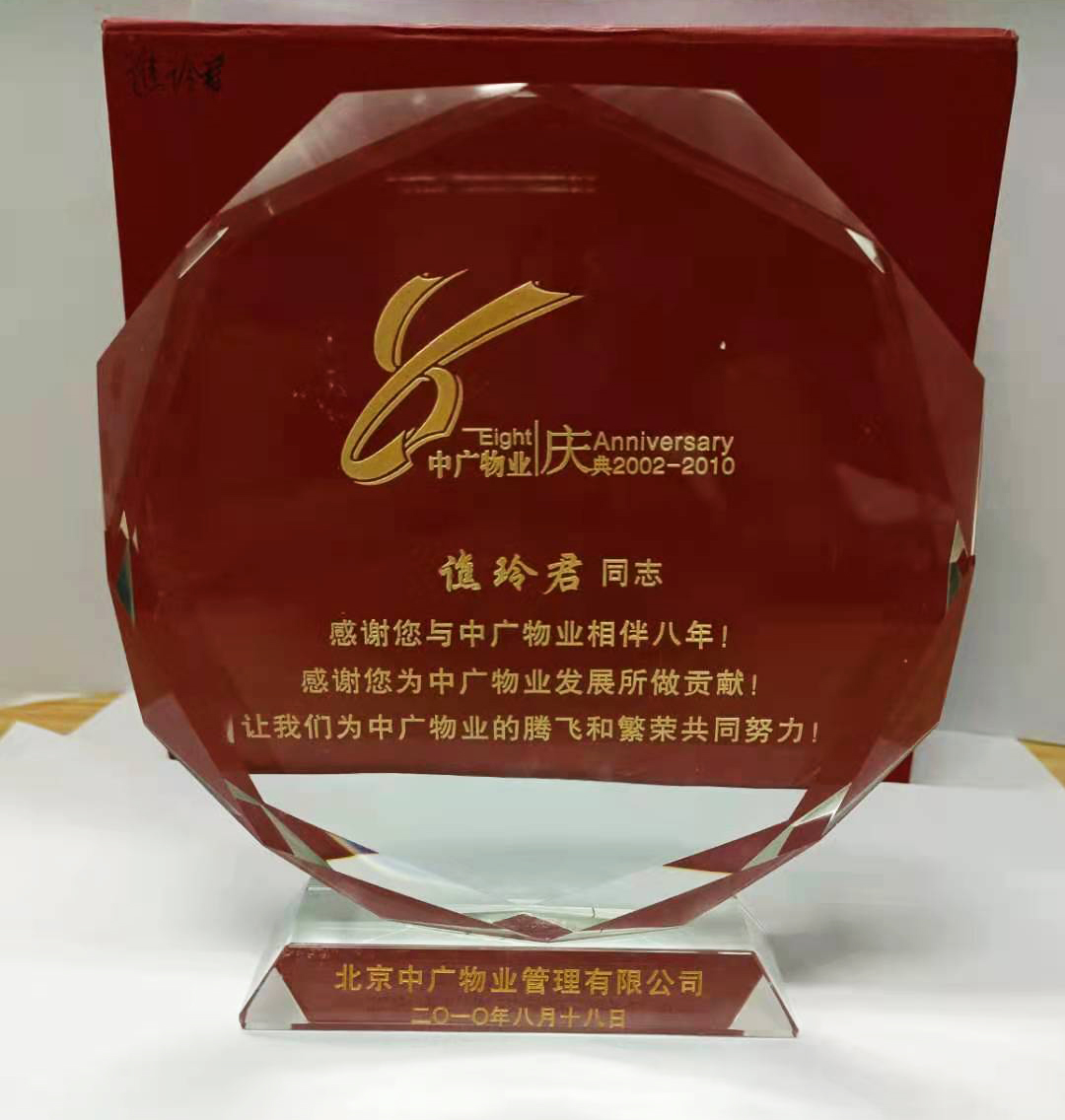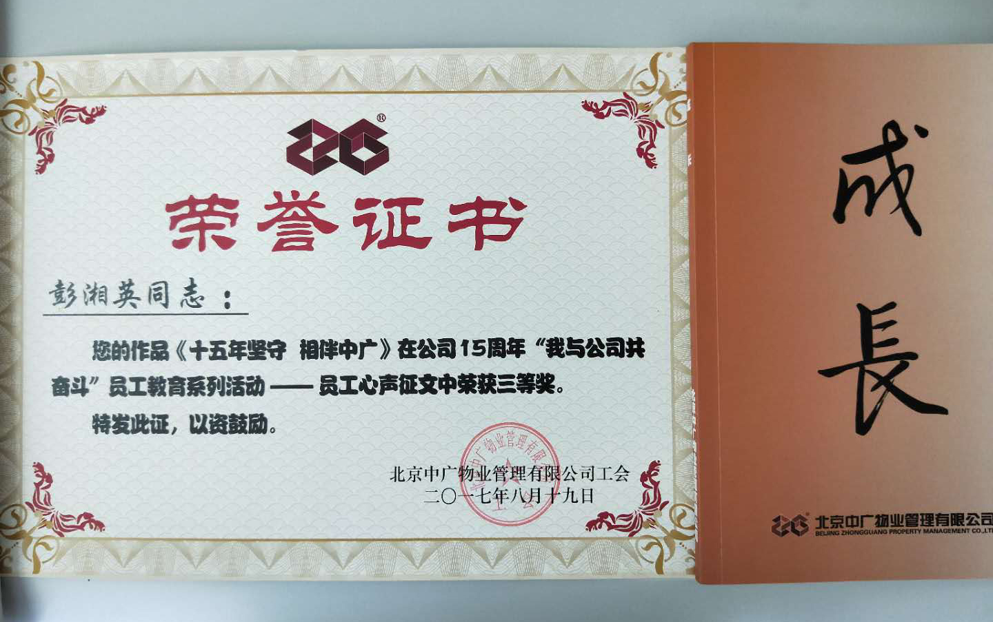當(dāng)?shù)弥獏⒓庸臼胖苣曜剷?huì)時(shí),我思緒萬千,會(huì)計(jì)從業(yè)資格證書、高級(jí)職業(yè)證書、水質(zhì)化驗(yàn)員證書、榮譽(yù)證書等,回首這么多年在公司的日子,我一直都在學(xué)習(xí)的過程中,從最初的庫房保管員到物資管理員及成本分配再到采購員,從最初的手工記賬到現(xiàn)在企業(yè)軟件管理,都離不開公司提供的學(xué)習(xí)機(jī)會(huì)。當(dāng)看到公司成立八周年紀(jì)念品時(shí),我百感交集,這一年我正式加入中國共產(chǎn)黨,成為一名黨員,是我一生的榮譽(yù),來之不易,倍感珍惜。值此公司成立19年之際,我無以為報(bào),只能引用八周年紀(jì)念品上的一句話,“讓我們?yōu)橹袕V物業(yè)的騰飛和繁榮共同努力吧!”衷心祝愿公司蒸蒸日上,更上一層樓!