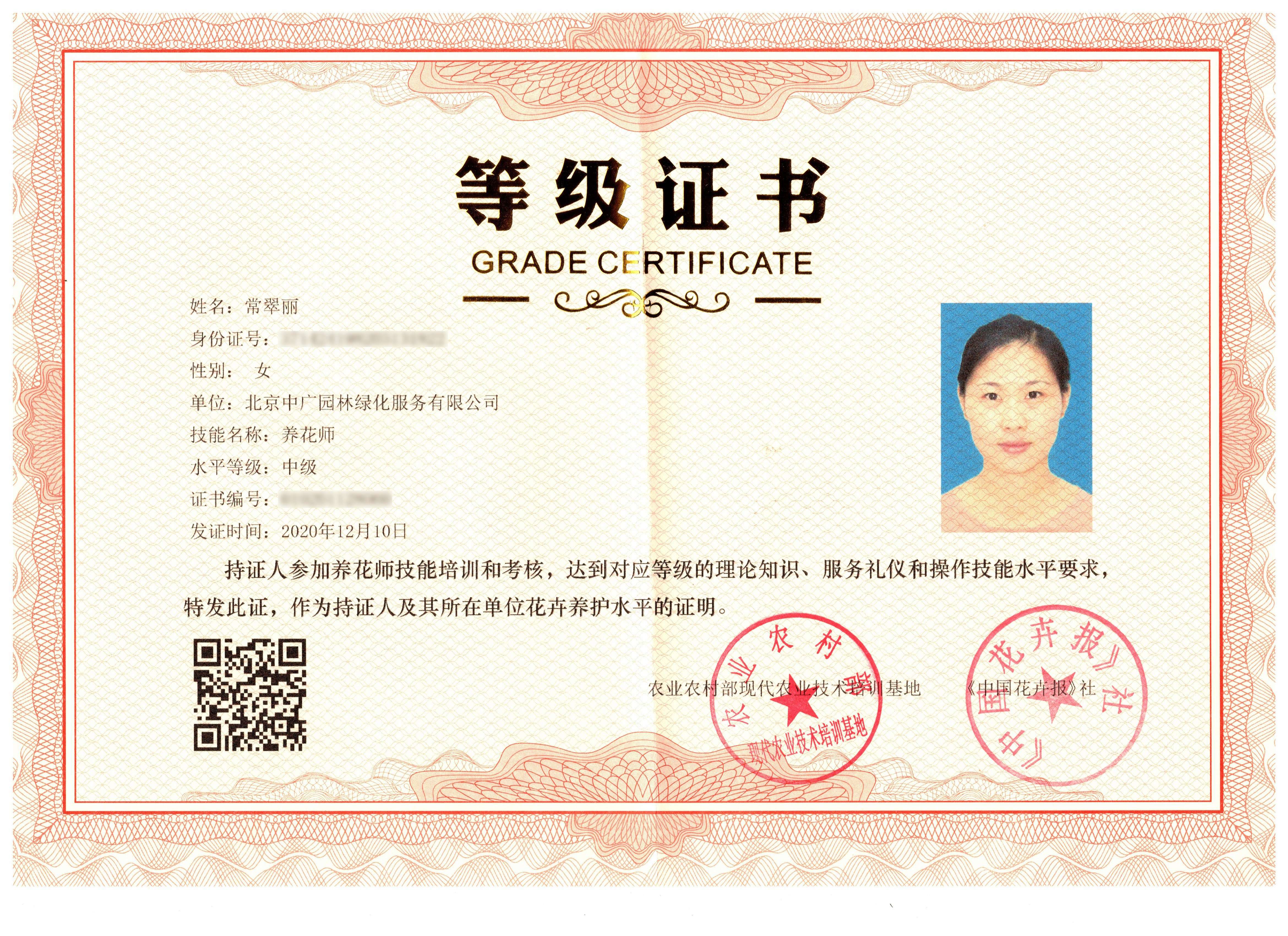中級(jí)養(yǎng)花師技能等級(jí)證書