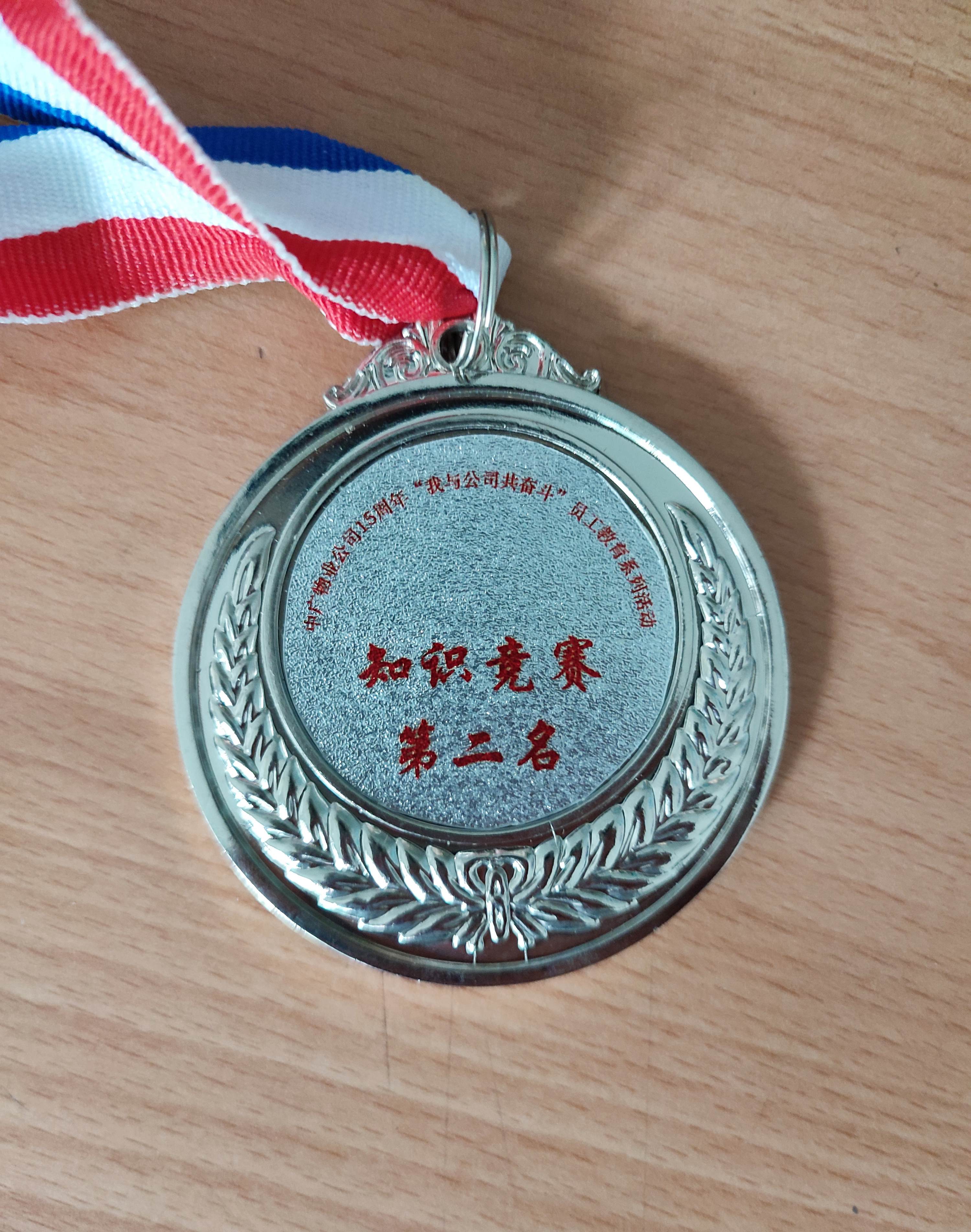 這面獎(jiǎng)牌來自公司15周年舉辦“我與公司共奮斗”知識(shí)競(jìng)賽。這次活動(dòng)既有知識(shí)性又有趣味性,既考驗(yàn)個(gè)人能力又展現(xiàn)團(tuán)隊(duì)風(fēng)采,大家相互配合,取長(zhǎng)補(bǔ)短,回顧了公司成立及發(fā)展的歷程,留下難忘記憶。我們圓滿完成整個(gè)賽程,體驗(yàn)到了成功,這種成功來源于團(tuán)隊(duì)同伴的幫助與支持,讓我們?yōu)樗诘膱F(tuán)隊(duì)驕傲、自豪,也更增強(qiáng)了凝聚力。感謝公司為員工們組織開展豐富多樣的團(tuán)建活動(dòng),凝心聚力,團(tuán)結(jié)協(xié)作,積極進(jìn)取,今后,我將與公司共同奮進(jìn),把各項(xiàng)工作做得更好。