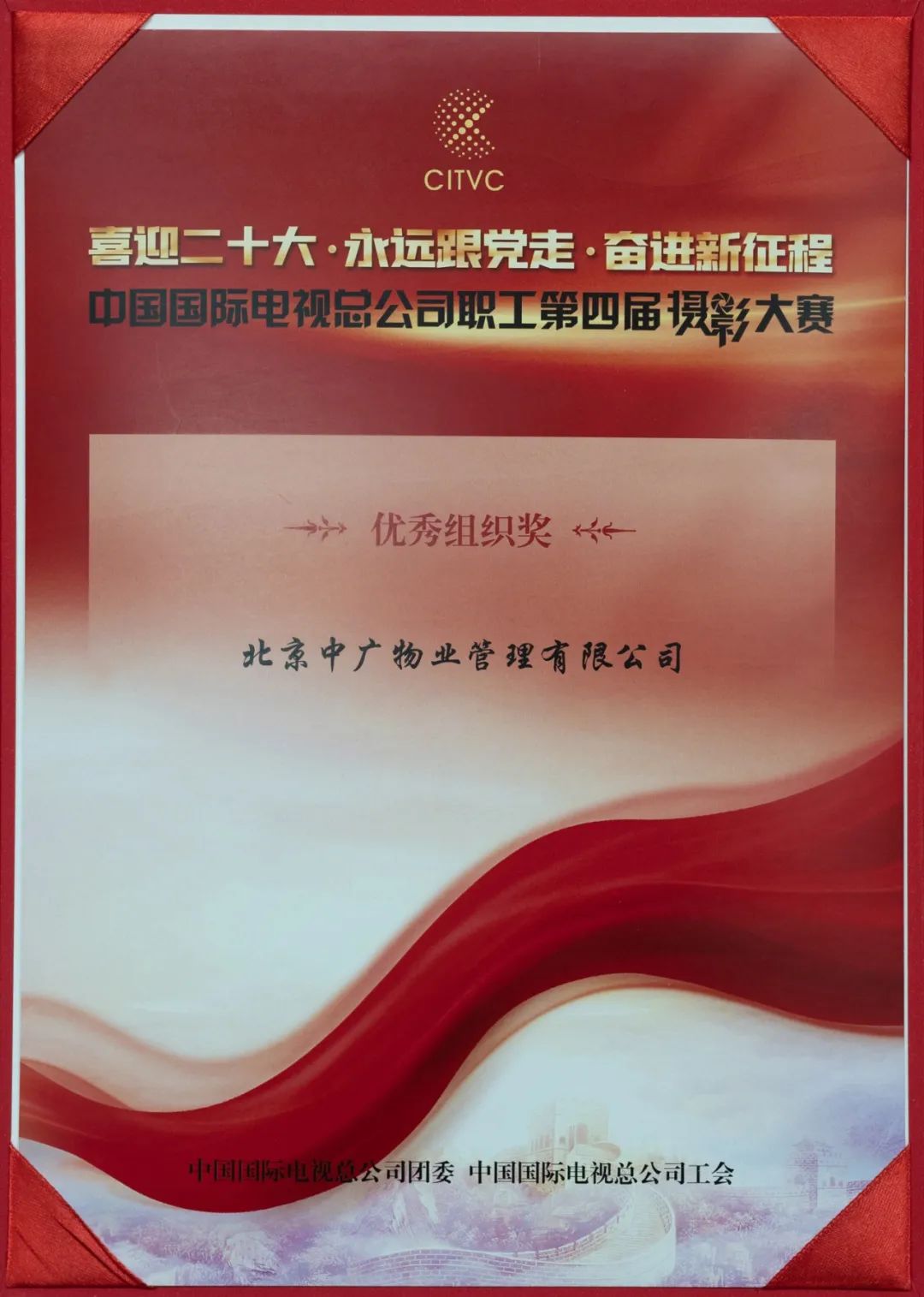 近日,北京中廣物業(yè)管理有限公司榮獲“喜迎二十大、永遠(yuǎn)跟黨走、奮進(jìn)新征程”中國國際電視總公司職工第四屆攝影大賽優(yōu)秀組織獎。