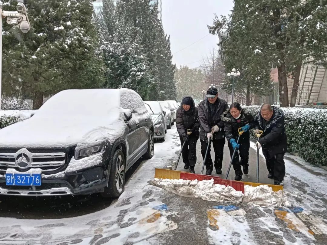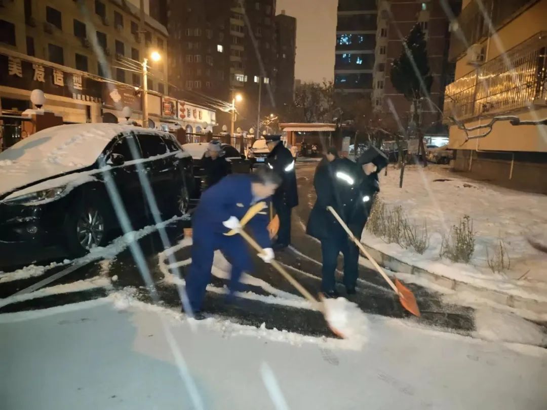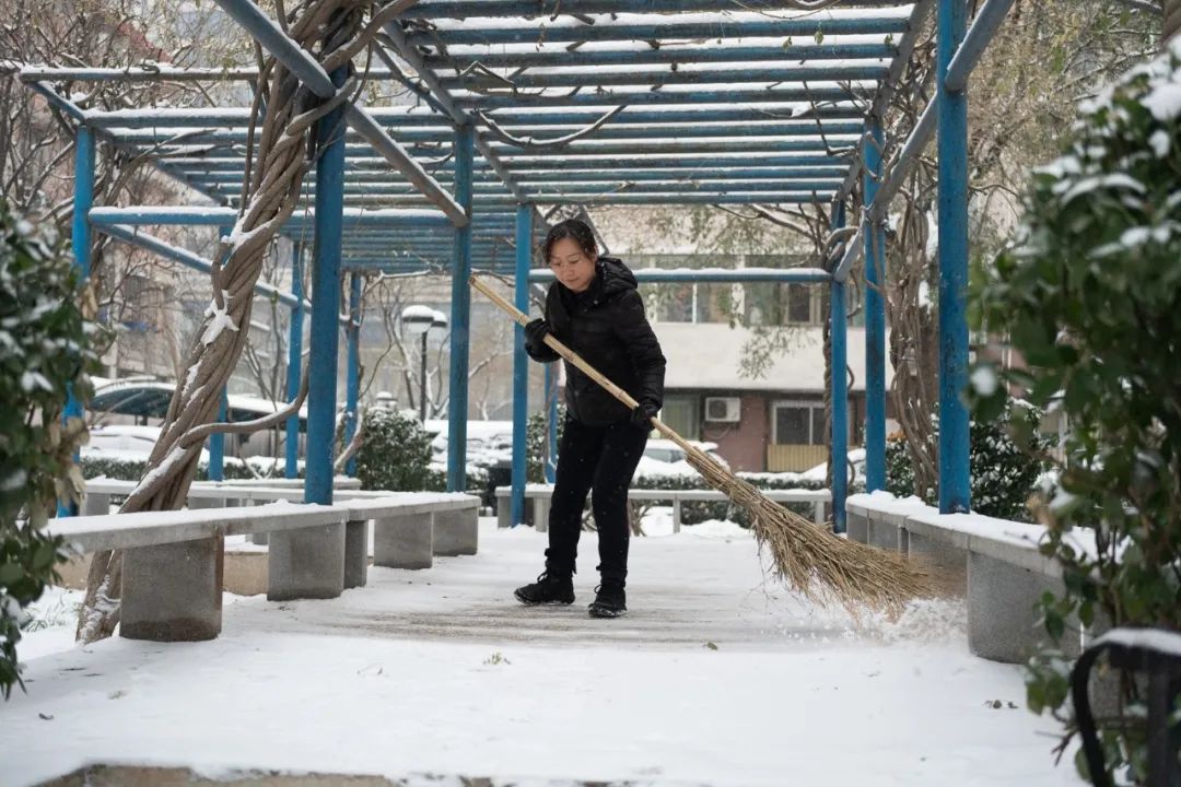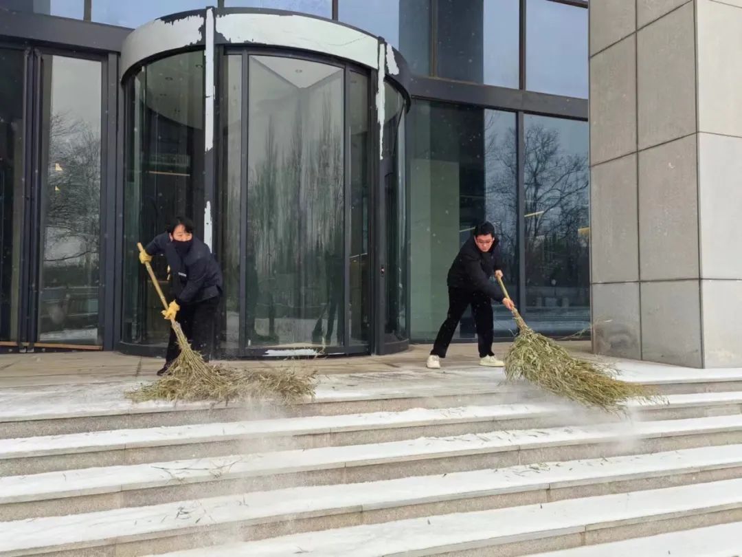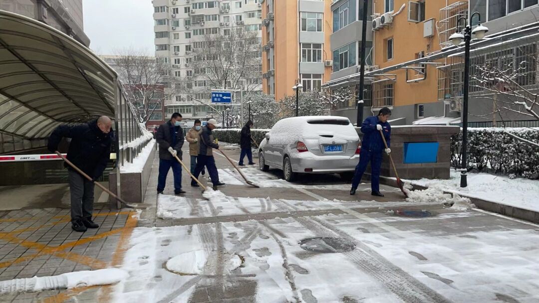 由于兩次降雪天氣間隔時間短、持續(xù)時間長,疊加效應(yīng)明顯。為最大限度地減少降雪天氣對業(yè)主出行造成的影響,公司各項目利用兩次降雪間歇期,合理調(diào)配人員,清點物資儲備,加強室外設(shè)施設(shè)備和室內(nèi)供暖系統(tǒng)巡視并做好防凍措施,對掃雪設(shè)備進行維護,全面做好掃雪鏟冰、供熱保障等應(yīng)對工作。降雪如期而至,迎著不斷飄落的雪花,中廣人在刺骨寒風(fēng)中揮帚清掃積雪,在冰天雪地里敲鏟清理結(jié)冰的身影遍布于轄區(qū)每一個角落,各項目按照“隨下隨清”的原則,采取先主后次,分段劃片等方式,確保轄區(qū)出入口、主干道無積雪、不結(jié)冰,保障業(yè)主出行安全。