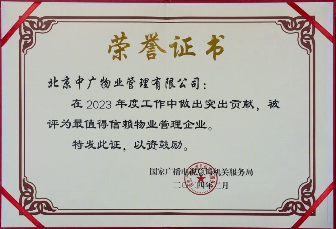 2月7日,國家廣播電視總局機關服務局召開2024年工作會議。北京中廣物業(yè)管理有限公司連續(xù)第十四年榮獲“最值得信賴物業(yè)管理企業(yè)”稱號。