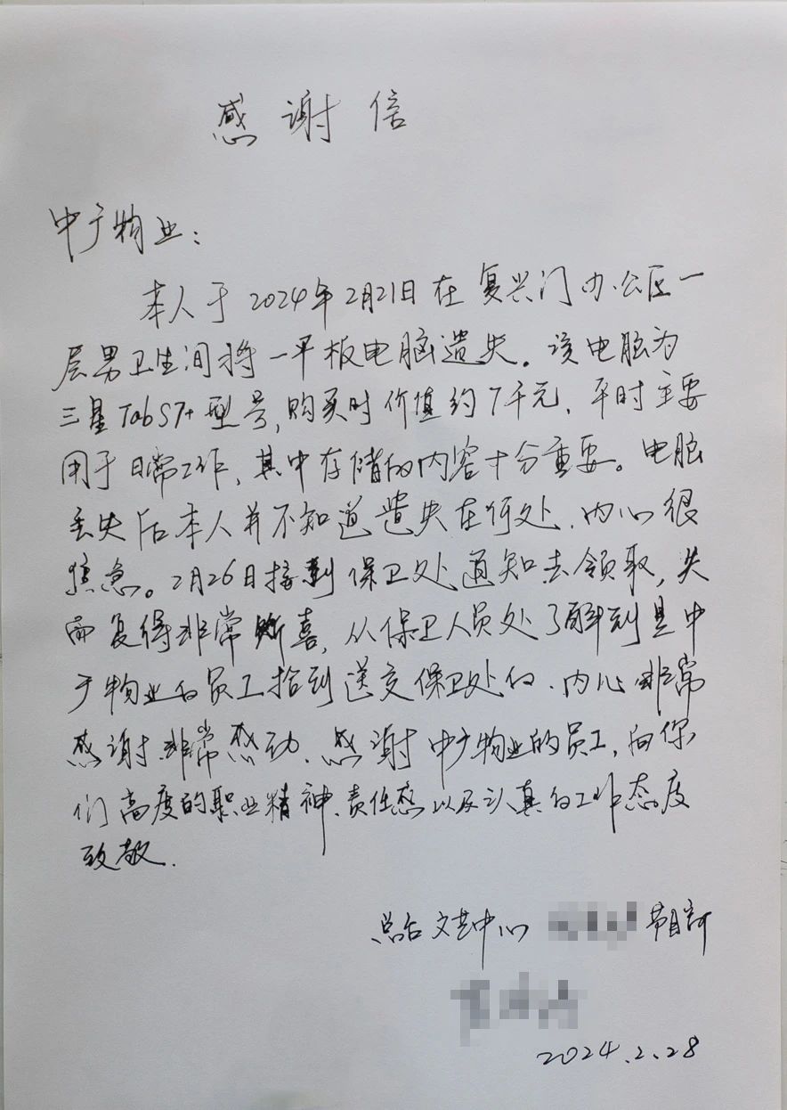 據(jù)了解,2月21日上午9:40左右,關(guān)亞艷正在總臺復(fù)興門辦公區(qū)B區(qū)一層男衛(wèi)生間進行保潔作業(yè),她發(fā)現(xiàn)窗臺處有一臺遺失的電腦,在原地等待近一個小時后,依然不見失主尋找認(rèn)領(lǐng),便將此情況匯報公司復(fù)興門項目負(fù)責(zé)人,并將電腦送交給總臺保衛(wèi)處。2月26日,總臺保衛(wèi)處與失主取得聯(lián)系,欣喜之余的失主得知電腦是被公司員工關(guān)亞艷撿到后,深深被她拾金不昧的高尚品德所感動,并親筆寫下一封感謝信,高度贊揚中廣人認(rèn)真的工作態(tài)度和優(yōu)良的職業(yè)道德,字里行間飽含著真摯的情感。