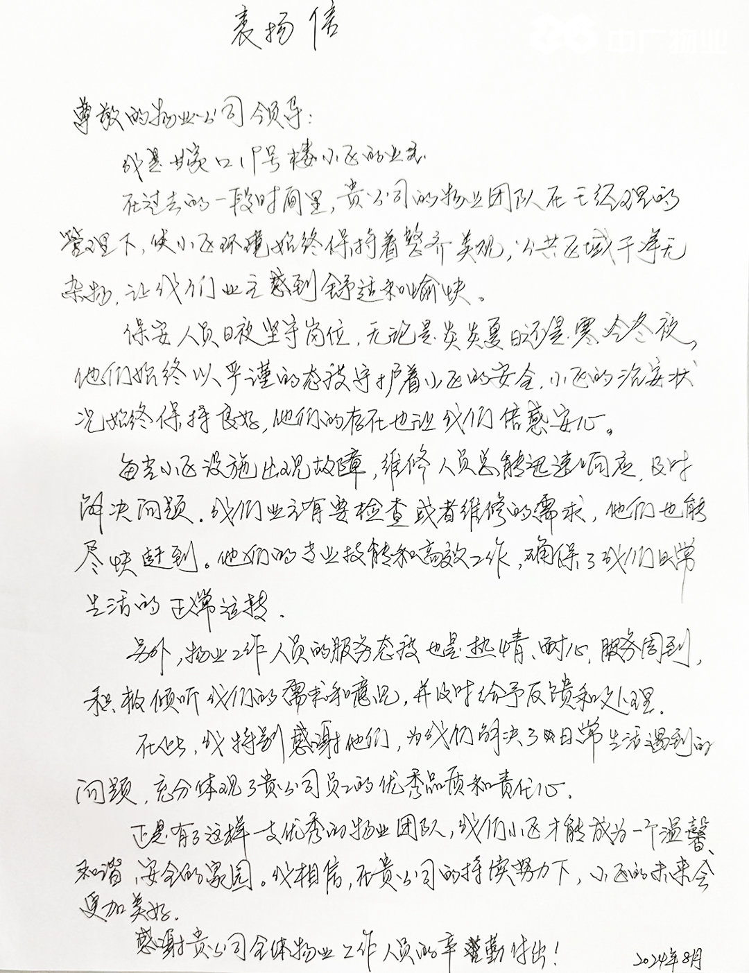 來信稱,在過去的一段時間里,公司物業(yè)團隊服務工作細致周到,積極傾聽業(yè)主的需求和意見,幫助解決日常生活中遇到的問題,充分體現(xiàn)了中廣人熱情、耐心的服務態(tài)度和高度責任感。同時,保安人員日夜堅守崗位,小區(qū)的治安狀況始終保持良好,讓業(yè)主倍感安心;每當業(yè)主家中報修,維修人員總能迅速響應,高效處置,憑借專業(yè)的技能,確保業(yè)主生活正常運轉(zhuǎn);保潔人員辛勤付出,使小區(qū)環(huán)境始終保持著整齊美觀,公共區(qū)域干凈無雜物,讓業(yè)主感到舒適和愉快。感謝公司物業(yè)團隊的辛勤付出,小區(qū)的未來會更加美好。