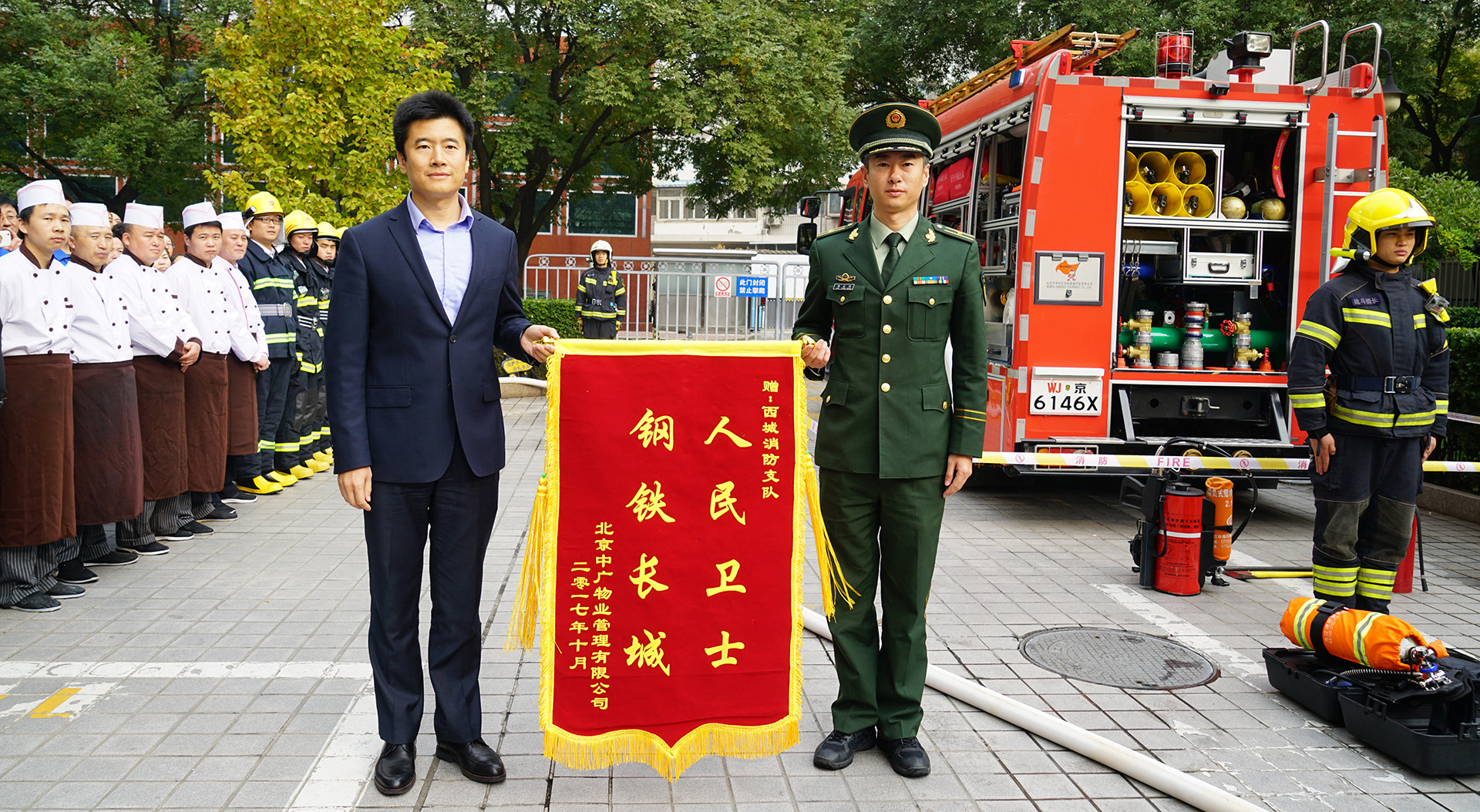 2017年10月25日上午九點(diǎn)三十分,由中廣物業(yè)管理有限公司音像資料館項(xiàng)目部與西城消防支隊(duì) “十九大”駐勤官兵聯(lián)合舉行消防安全知識(shí)培訓(xùn),首先公司總經(jīng)理安委會(huì)主任崔立新代表公司向西城消防支隊(duì)贈(zèng)送“人民衛(wèi)士,鋼鐵長城”錦旗表示感謝,感謝西城消防支隊(duì)一直以來對(duì)公司消防安全工作的支持與幫助。西城消防支隊(duì)劉永強(qiáng)警官表示:十九大勝利閉幕,住地周邊沒有發(fā)生起火冒煙情況,離不開各單位的共同努力,特別是中國廣播電視音像資料館大廈,地理位置特別重要,臨近代表住地,消防安全意識(shí)強(qiáng)、工作到位,感謝中廣物業(yè)給予消防工作的支持。隨后消防支隊(duì)駐勤消防員進(jìn)行消防培訓(xùn),培訓(xùn)內(nèi)容理論與實(shí)際相結(jié)合,消防支隊(duì)駐勤消防員詳細(xì)講解了消防車配置設(shè)施及使用、“119”消防報(bào)警流程及注意事項(xiàng),講解并實(shí)際操作了消防空氣呼吸器的佩戴及使用和室外消火栓的使用。參加培訓(xùn)的有公司機(jī)關(guān)部室全體員工、公司各部門的消防骨干、駐大廈各單位員工及餐廳工作人員總計(jì)100余人參加了培訓(xùn),通過消防安全知識(shí)的培訓(xùn),提升了大家的消防安全責(zé)任意識(shí)及應(yīng)對(duì)初期火災(zāi)的處置能力。