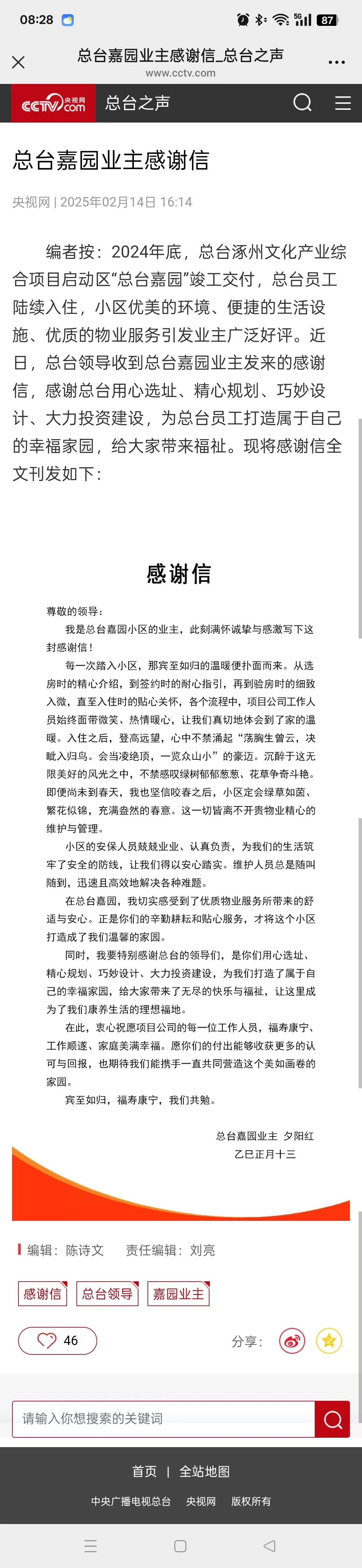 據(jù)央視網(wǎng)總臺之聲報道,近日,總臺領(lǐng)導(dǎo)收到總臺嘉園業(yè)主“夕陽紅”發(fā)來的感謝信,信中感謝總臺用心選址、精心規(guī)劃、巧妙設(shè)計(jì)、大力投資建設(shè),還對中廣物業(yè)公司優(yōu)質(zhì)服務(wù)給予表揚(yáng)。